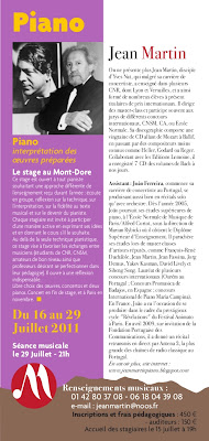 Ce stage auras lieu du 16 au 29 juillet 2011 et est ouvert à tout pianiste souhaitant une approche différente de l’enseignement reçu durant l’année: écoute en groupe, réflexion sur la technique, sur l’interprétation, sur la fidélité au texte musical et sur le devenir du pianiste. Chaque stagiaire est invité à participer d’une manière active en exprimant ses idées et en donnant le cours s’il le souhaite. Au delà de la seule technique pianistique, ce stage vise à favoriser les échanges entre musiciens (étudiants de CNR, CNSM, amateurs de bon niveau ainsi que professeurs désirant se perfectionner dans leur pédagogie). Il ouvre à une réflexion indispensable. Libre choix des œuvres, concertos et deux pianos. Concert en fin de stage, et à Paris en novembre.